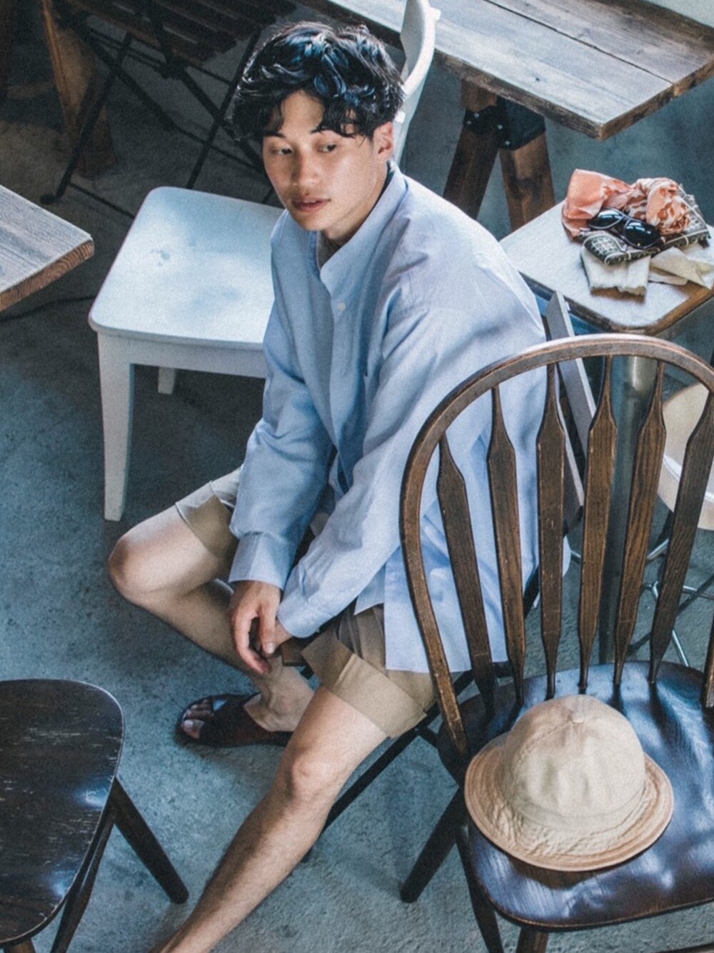 秋な装い🌝 白スタンドカラーシャツの上に 青スタンドカラーシャツをレイヤード◎ ツータック入りのショートパンツは 程良く広がり、足を綺麗に見せてくれる◎ レザーサンダルを合わせたけど、 秋本番は革靴と合わせよう◎