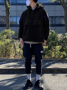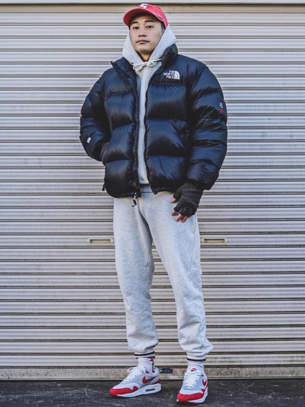 THE NORTH FACEのヌプシを使った あったかスポーツスタイル⛹️♂️ パーカーにスウェットパンツで セットアップ風に◎ シュプのキャップと スニーカーはAIr Max 1 を履いて赤の色合わせ🦞 ヌプシとフィンガーレスグローブで 強そうなボクサーのイメージで🥊💨