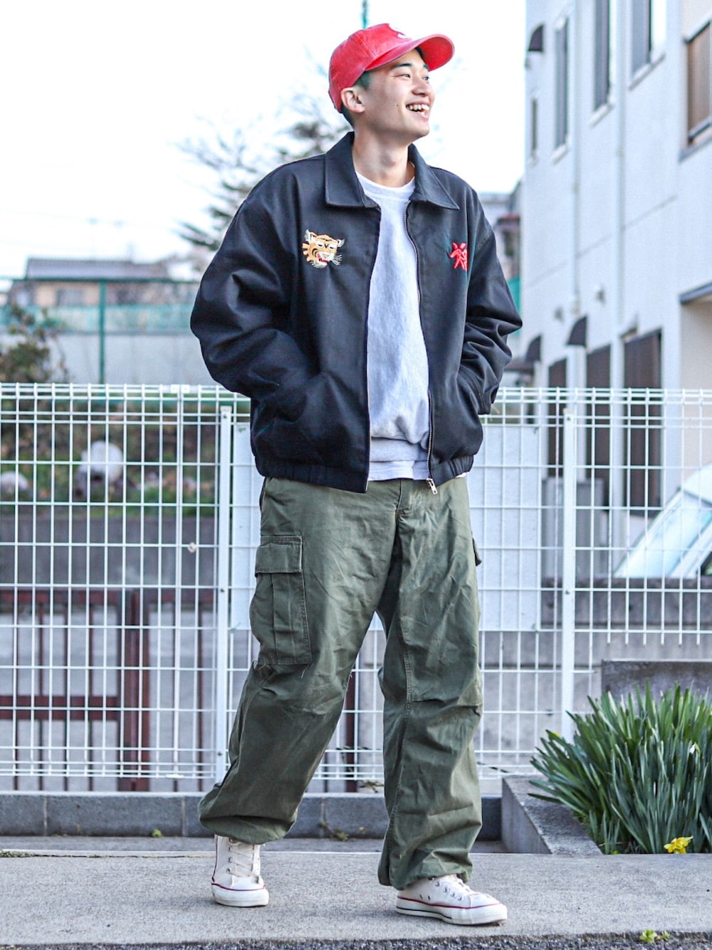 Perushuのベトジャン がかっこよくて可愛い🤤 Mサイズ着用ですが スウェット上からでも ゆったり羽織れます💯 今回は野暮ったく カーゴパンツと合わせました🦖