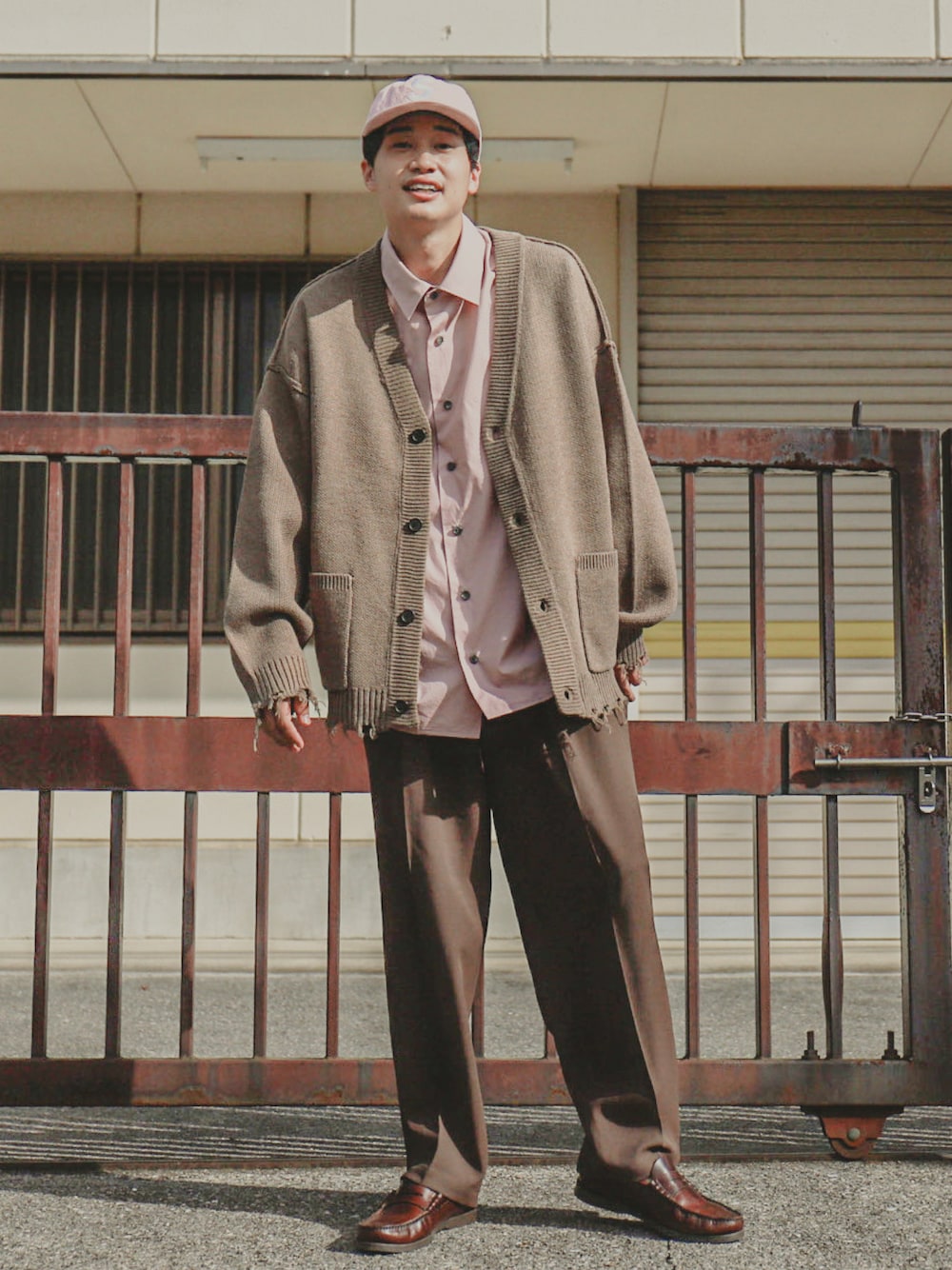 ブラウンとピンク👏✨ JUNRedの ソフトカルゼワイドタックパンツに ピンクシャツを合わせて ベージュのカーディガンを羽織りました 小物のキャップもピンク合わせで 靴はブラウンのローファーです◎