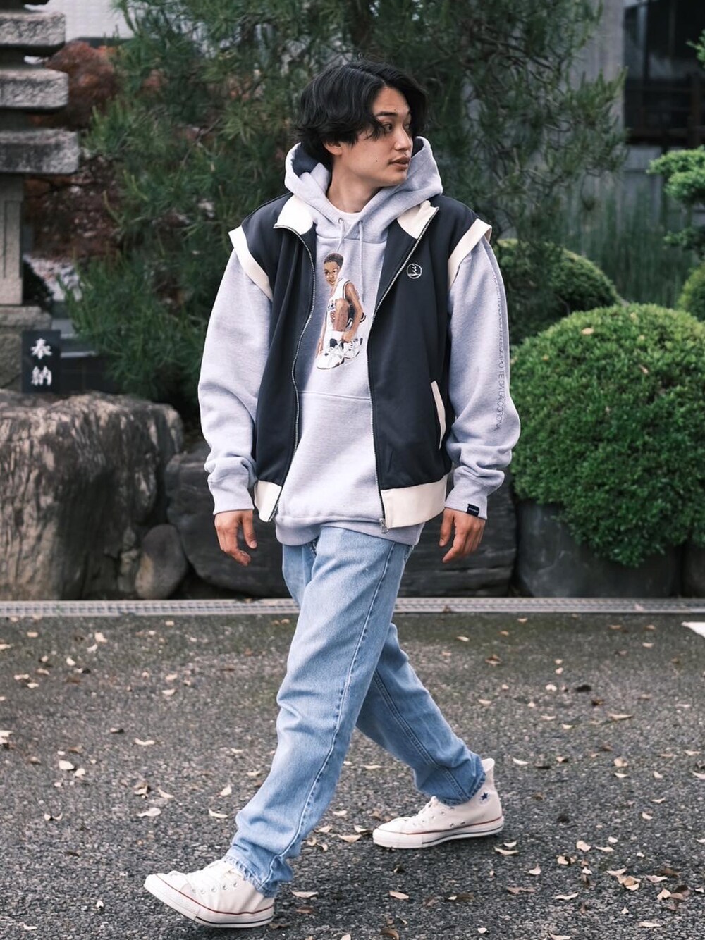 すけのベスト「ロゴ刺繍入り裏毛ジップアップベスト【ファッションインフルエンサー三木克海&すけ×anown限定コラボ 】」を使ったコーディネート