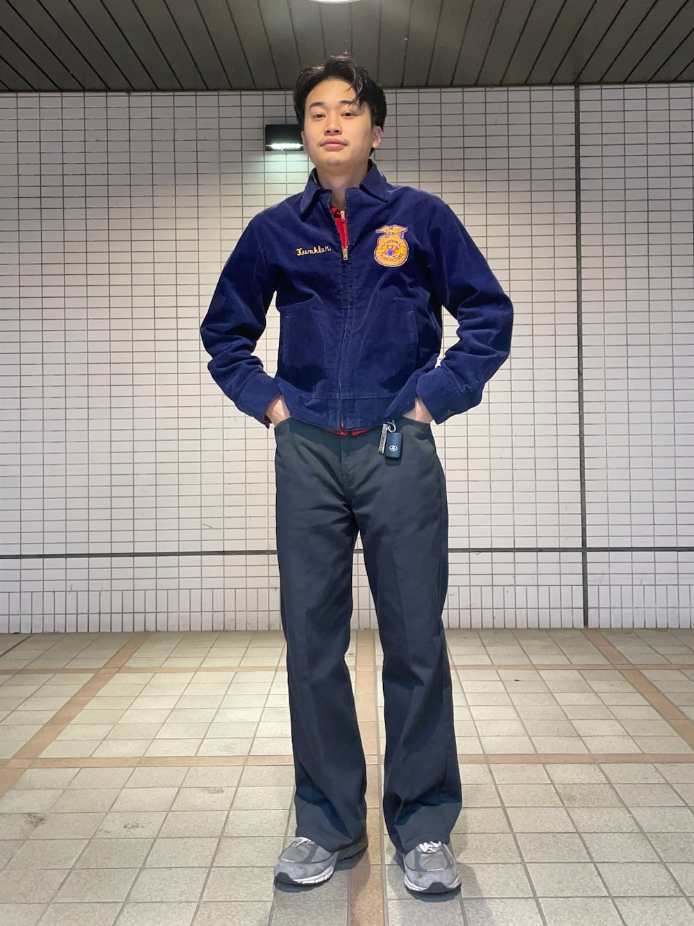 古着のFFAジャケットの中に 赤のシャツジャケットを◎