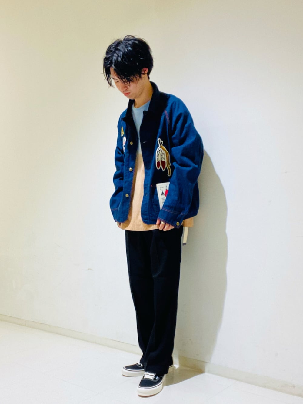ワッペン付デニムジャケットとドレスパンツの 化学反応が素晴らしいです!! 70'sらしさが出ますね。