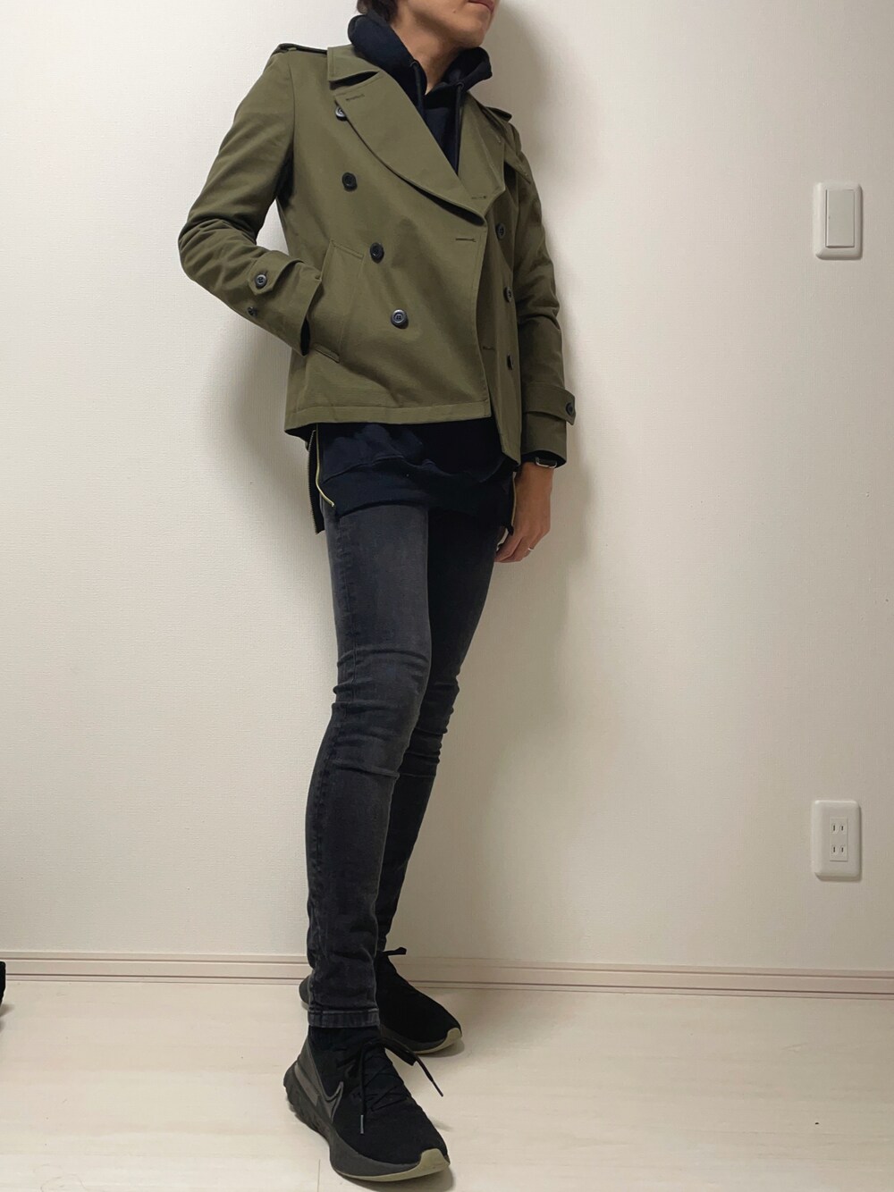 サリバンのショート丈トレンチジャケットをメインに。 綺麗でミリ色もあって好きなジャケット。 ボタン閉めても開けてもカッコいいんです。チンストラップもナイス。 他をブラックでまとめつつ、ロング丈のAmazonで買った謎のパーカー笑とランニングシューズでスポーティにしました。 昔買ったスキニー、パッツパツで笑いますよね