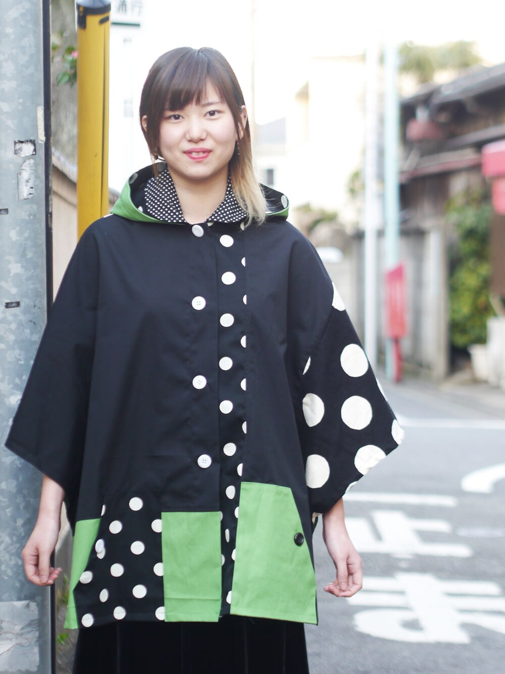 NIRAME.COのポンチョ「スポンジぽんちょ ~モノトーン×緑~」を使ったコーディネート