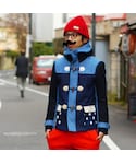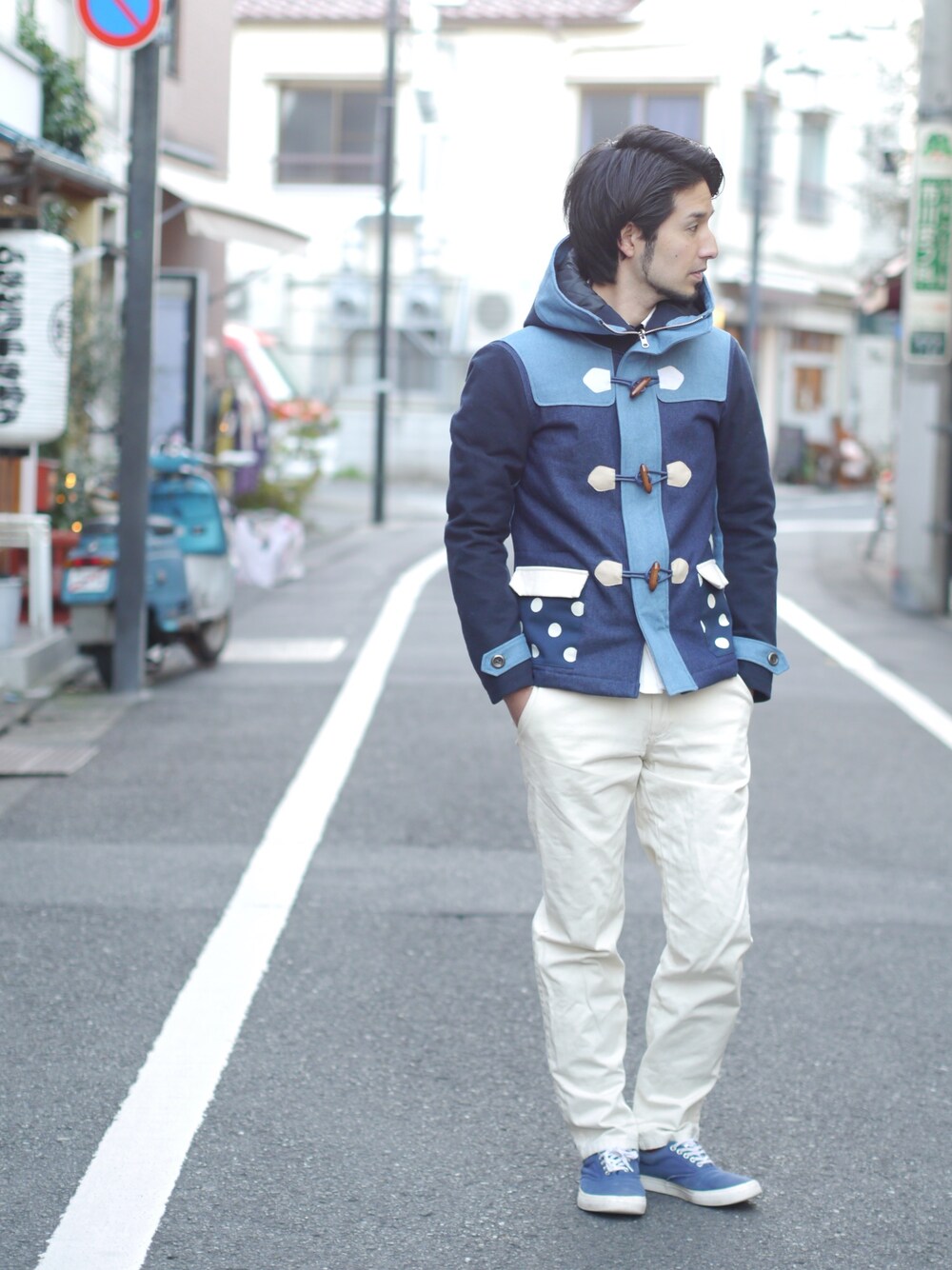 NIRAME.COのダッフルコート「ジャングルジムだっふる。 デニム ドット」を使ったコーディネート