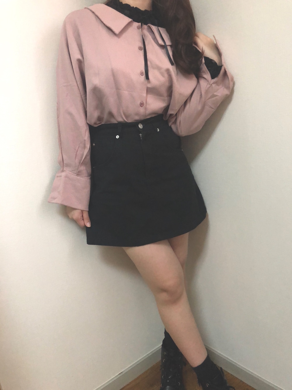 . . . シャツの中に アクセントで 黒レースを着て 露出控えめにしたコーデです 袖のボタンを止めずに着ると 中のレースの袖がチラチラ見えて それもまた かわいい印象かなっ😙 . レースを中に着るコーデは よくするから 着回し力のある リボンが付いてて 袖のフリルが あるのが お気に入り⭐︎
