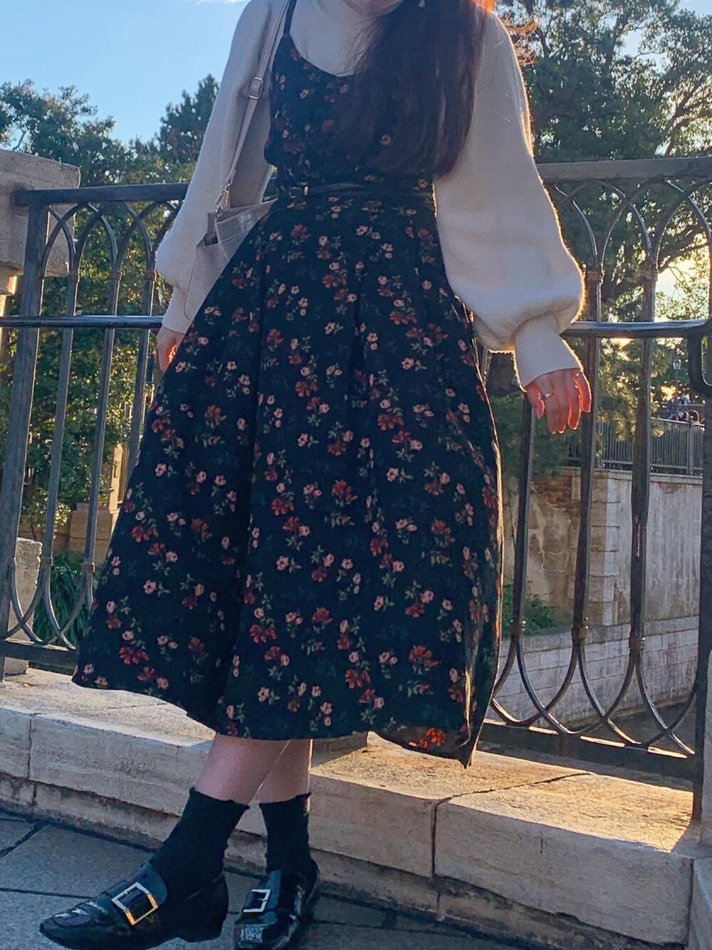 先日、ディズニーに行った時のコーデ🐭 黒ベースにカラーのある花柄キャミワンピを #littletriptoheaven さんで購入しました 何点か似たキャミワンピがありましたが、 シンプルなデザインのニットに合わせたかったので、 派手目な花柄を選びました! 靴とベルトは、黒でまとめてます。 鞄だけ白のクロコ柄。 私自身、最近は、鞄の肩紐をウエスト位置くらいまで短くするのが好みです😙🌼 ちなみに ストレートヘアーにミニーちゃんの赤リボンのカチューシャつけてました🏰