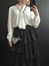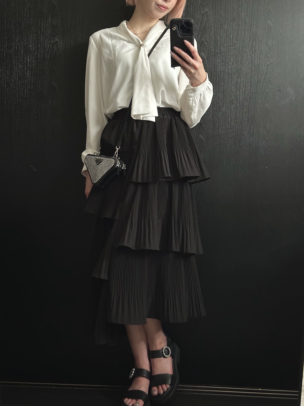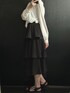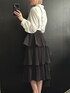 \肌見せなしで”いい女”/ 【韓国っぽクラシカルコーデ🖤】 舞台観に行った時のコーデ👗 モノトーンでシンプルにまとめつつ、 ティアードスカートが特徴的で可愛い💗 少し高めにウエストマークすることで脚長効果も忘れずに🤫💕 バックもアクセントになって可愛いの😍 小物類だけカラーを変えたりもいいかもっ!