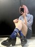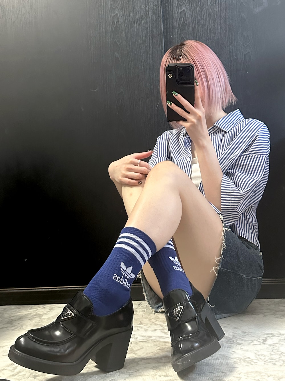 \再び人気のadidasで/ 【韓国っぽカジュアルストリートコーデ💙】 最近adidasを取り入れるの流行ってるよね✨ 定番のロゴソックスが安定に可愛い😍 トップスもブルーのストライプシャツにして、 ブルーコーデに🦋 スポーティになりすぎないように、太ヒールのローファーと合わせたよ🎶