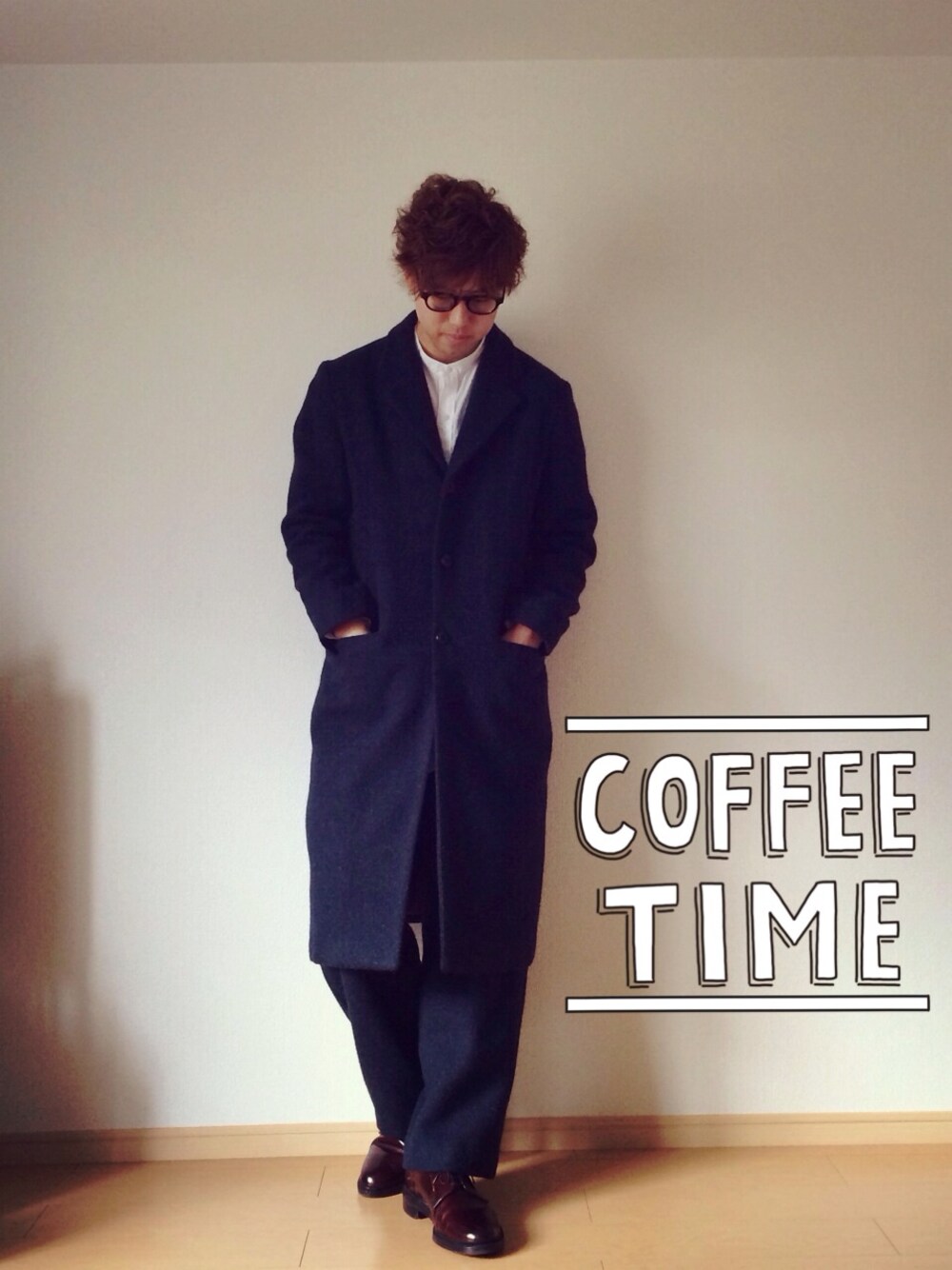 マイビューのチェスターコートとパンツのセットアップ。これ、ハンッッッッッッパないです!すごく暖かい。毛布にくるまってる時のよう。ケンピウールで表面のざらっとした触り心地も好きです。ノーカラーシャツもマイビュー。このブランドやっぱり大好きだなぁ。