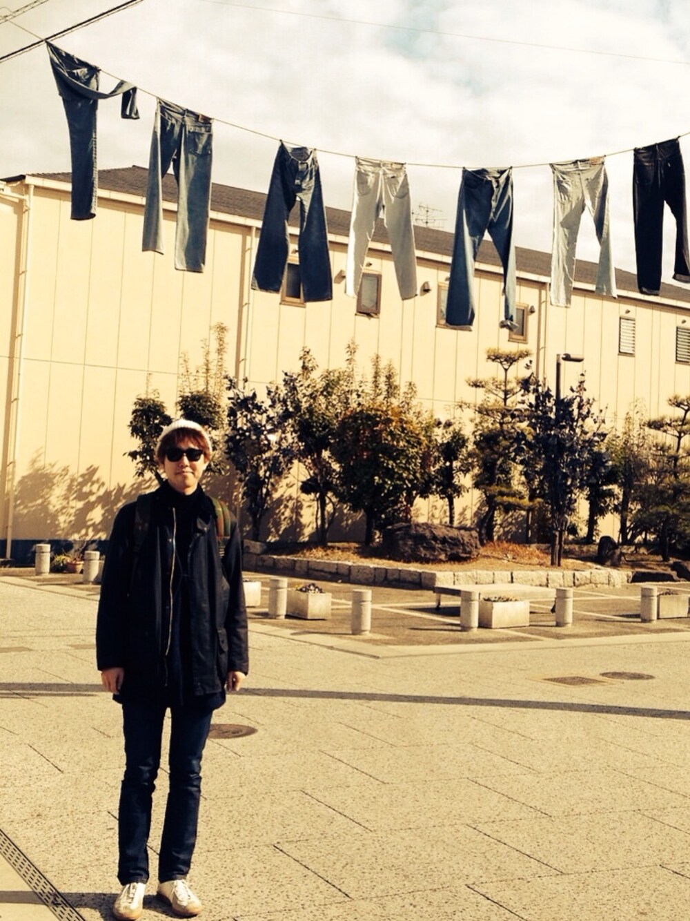 デニムの聖地、児島ジーンズストリートでの1枚。もう道中興奮しっぱなしでした。ジャパンブルージーンズで新しいデニムも買っちゃいました。 デニムのエイジングって本当好きです。