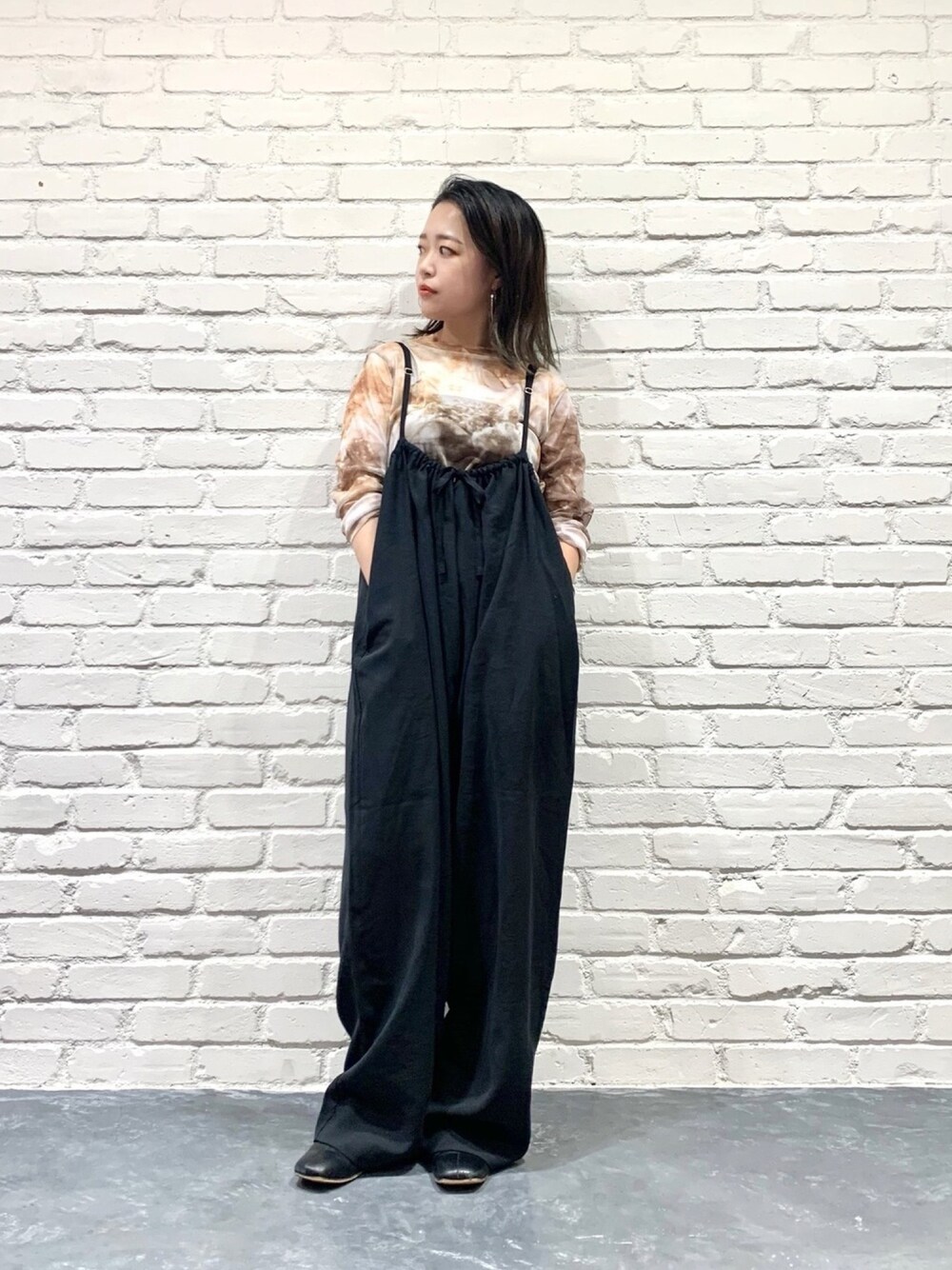 新作のタイダイチュールトップスを使った今気分なスタイリング。 tops: 【サイズ感】程良いフィット感で緩すぎないシルエット。ワイドパンツやロングスカートなどのボトムにもバランス良く合わせていただける一枚です。ラインを拾いすぎないのでメインにしても良し、サロペットやジャケットのインナーとしてもおすすめです。 【着心地】軽くて薄い生地感。シャリっとした肌触りで晩夏の時期にも暑苦しくなく着ていただけます。 bottom: 【サイズ感】肩紐で調節出来るので低身長の方にも安心して着ていただけます。ゆったりとした身頃なのでインナーを選ばないデザインですが、おすすめはスッキリとしたシルエットのものと合わせていただくとバランスがとりやすくなります。 【着心地】レーヨン91%、ポリエステル9%でテロっとした生地感。肌触りも滑らかで、シーズンレスで使いやすいアイテムです。 shoes: staff私物