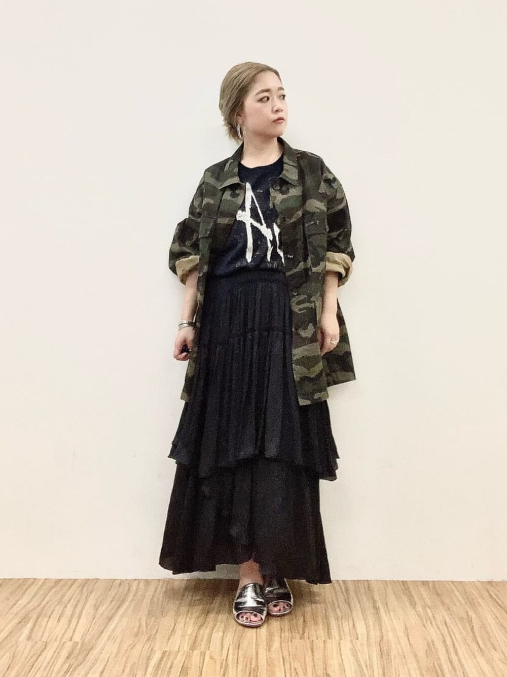 ミリタリージャケット×Tシャツなので、ボトムは女性らしいティアードスカート! スニーカーではなくミュールで抜け感を作ったのもポイントです。 ●ミリタリージャケット 【サイズ感】インナーを選ばず着られる、ゆとりのあるサイズ感のジャケット。スウェットやニットも着られるくらいです。ヒップが隠れる丈感で、スキニーや細身のパンツとの相性も◎ 【着心地】袖を捲って手首を見せてスッキリと着られる、シャツジャケットぽく使用できる生地感なので着やすいです。しっかりとしているのでもちろんアウターとしても◎重すぎず、肩のこらない軽アウター。 ●サテンティアードスカート 【サイズ感】丈は十分にあるので少しハイウエスト気味にはいています。ウエスト後ろはゴム仕様。 【着心地】着脱しやすいウエストゴム仕様です。サラッとしていて動きやすい生地。