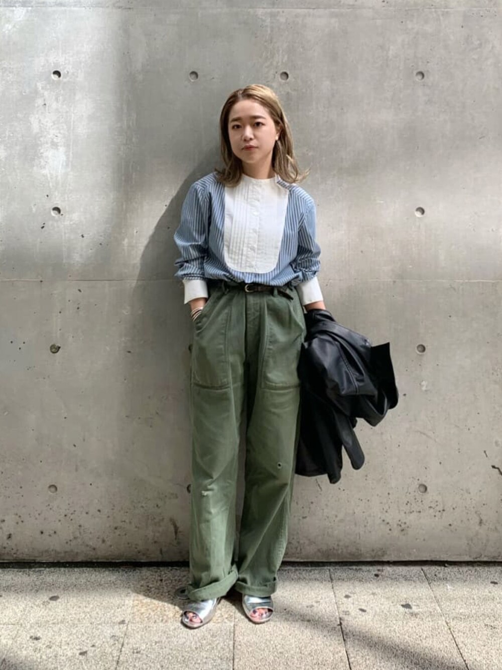 Instagram @shiori_n87 よろしくお願いします✨ ドレスシャツに古着のパンツを合わせた古着mixコーデ。 ●シンセティックレザーシャツジャケット 【サイズ感】インナーにはスウェットやニットも着れるような、ゆとりのあるサイズ感。長い期間着まわせます! 【着心地】シャツジャケットなので軽くて着やすいです。柔らかく、持ち運びもしやすいです。 ●ストライプドレスシャツ 【サイズ感】腰にかかる丈感です。身頃は程よいサイズ感なのでゆったりしすぎず綺麗なシルエットで着ることができます。襟元や袖のカラー切り替えでメリハリが出てすっきり見えるのでボトムが選びやすいデザイン。 【着心地】長く着られる生地。春や秋、夏の冷房が強い場所にも。レイヤードして秋冬にも活躍します。程よいハリ感で着やすいです。