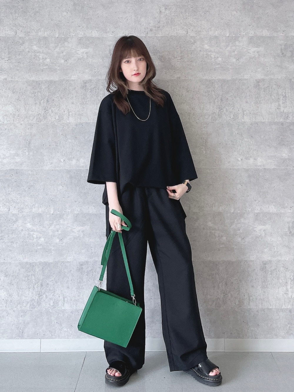 夏のオールブラックコーデ ゆるっとしたシルエットで楽ちんに。 ミニバッグで差し色を投入してみました。