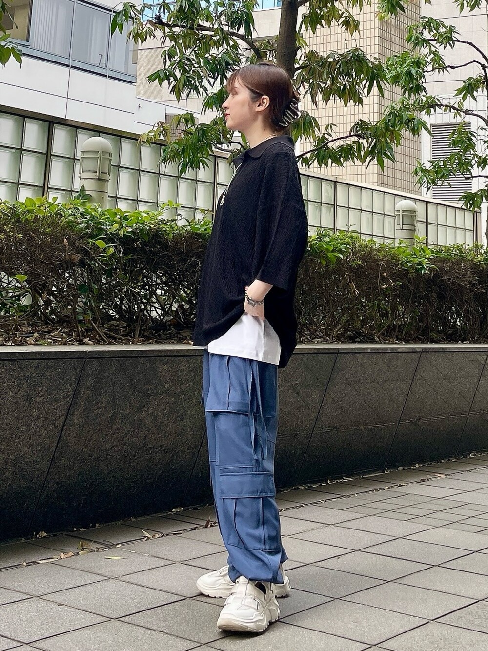 ゆるっとメンズライクコーデ ニットポロはサラッと薄手の素材なので、 レイヤードしても涼しく着られます