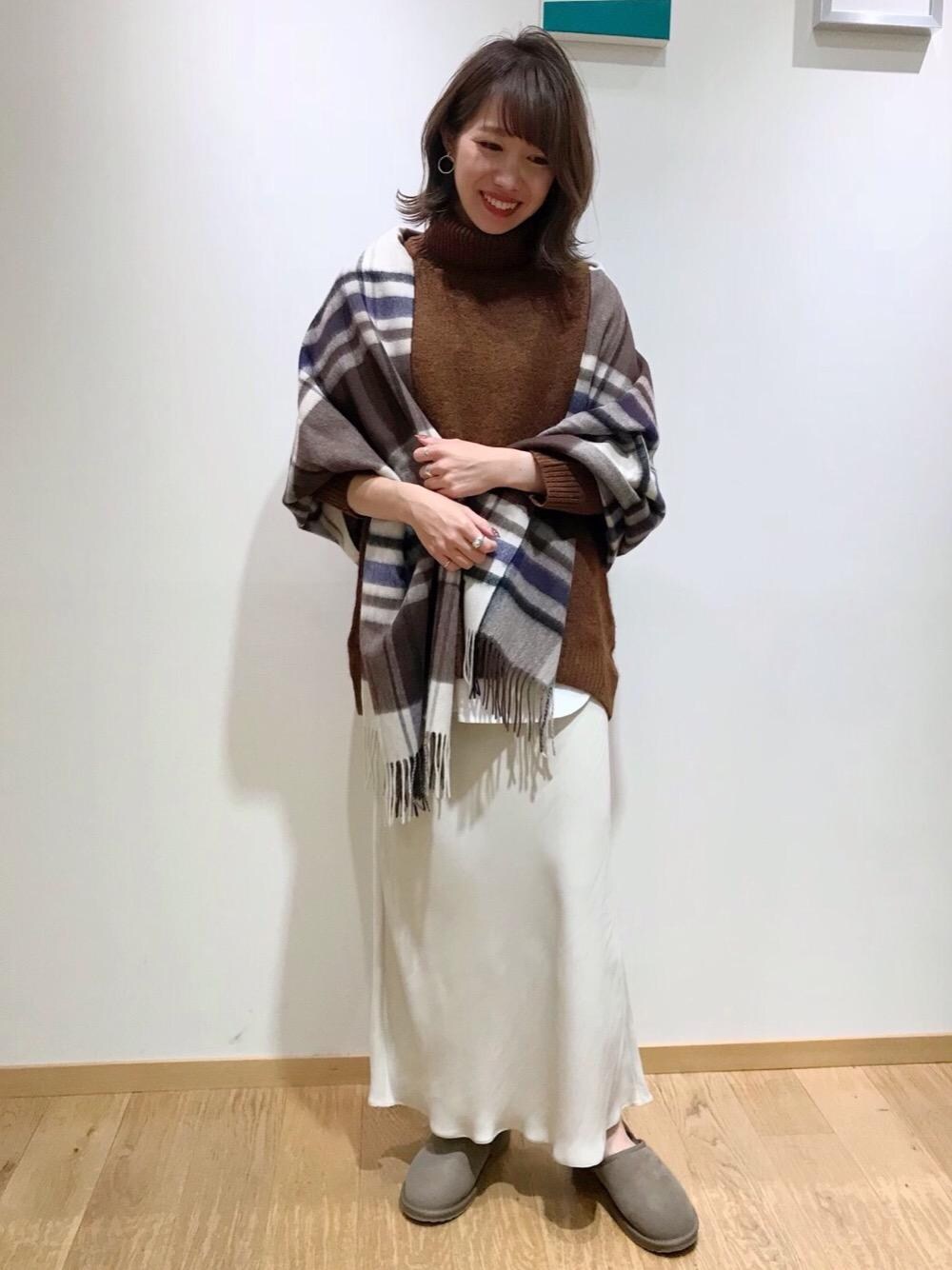 身長163cm、着用サイズ(ニット:FREE/スカート:FREE/Tシャツ:FREE) ゆるっとしたサイズ感がかわいいニットと、すっきりしたナローシルエットのスカートを合わせた鉄板コーディネートです!Tシャツをインナーに合わせてレイヤードすることで鮮度をUPさせました。ストールは防寒対策にはもちろん、コーディネートのアクセントにもなってくれます♪