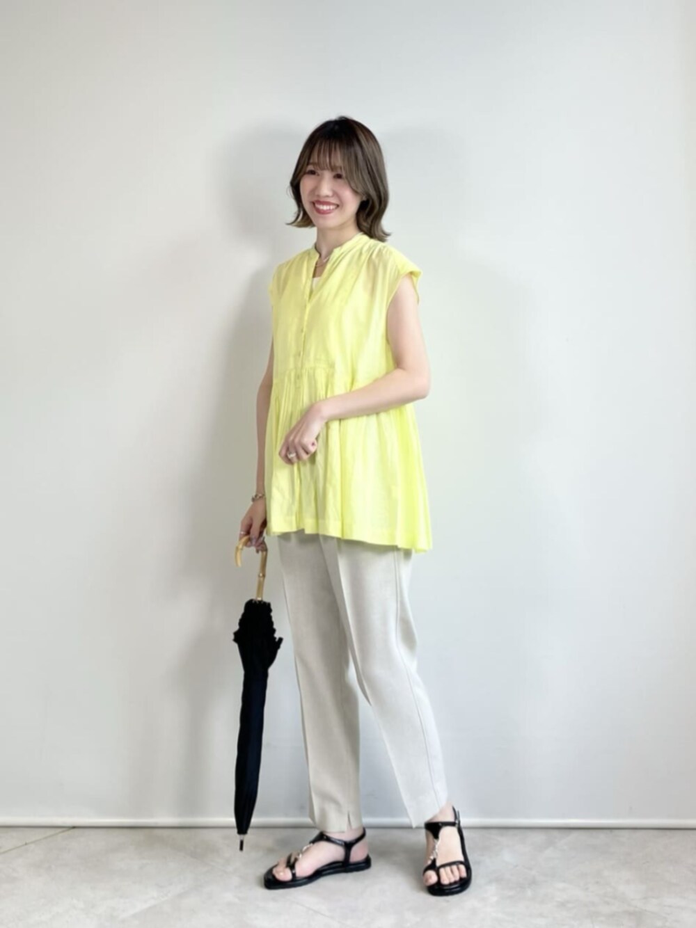【サイズ感】 トップス:標準的 ボトムス:標準的 シューズ: 標準的 【コーディネートポイント】 爽やかなイエローが目を惹くので、他のアイテムは色味を抑えてまとめました。華やかな印象になるので、お出かけにもおすすめなスタイリングです♪