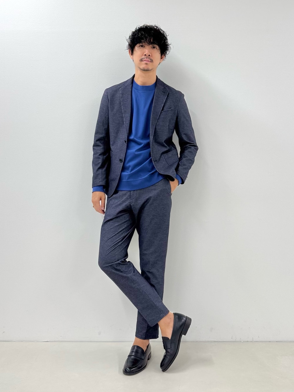 デニム調のジャージー素材のセットアップ。 無駄を省いた簡素的なデザインですが、十分きっちり見えます。 ジャケットは身幅に程よいゆとりを、パンツは腰まわりに程よいゆとりを。 インナーは毎シーズン好評のドレスTシャツ。 パリッとしすぎないブルーで、ジャケットのネイビーとの馴染みもよく、派手になりすぎません。 それぞれ単品でお使いいただけるので、このワンセットがあると、コーディネートの幅も広がります。 是非参考にしてみてください。 着用サイズ ジャケット:Mサイズ Tシャツ:Mサイズ パンツ:Mサイズ 身長178cm/体重64kg/ウエスト74cm
