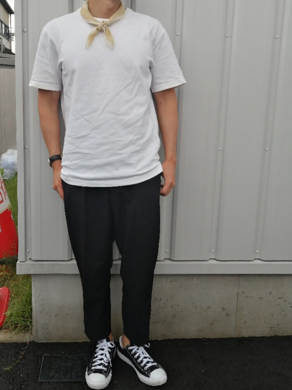 シンプルコーデにスカーフを足しました👔 【size】 Tシャツ M パンツ レディースXL シューズ 26.5
