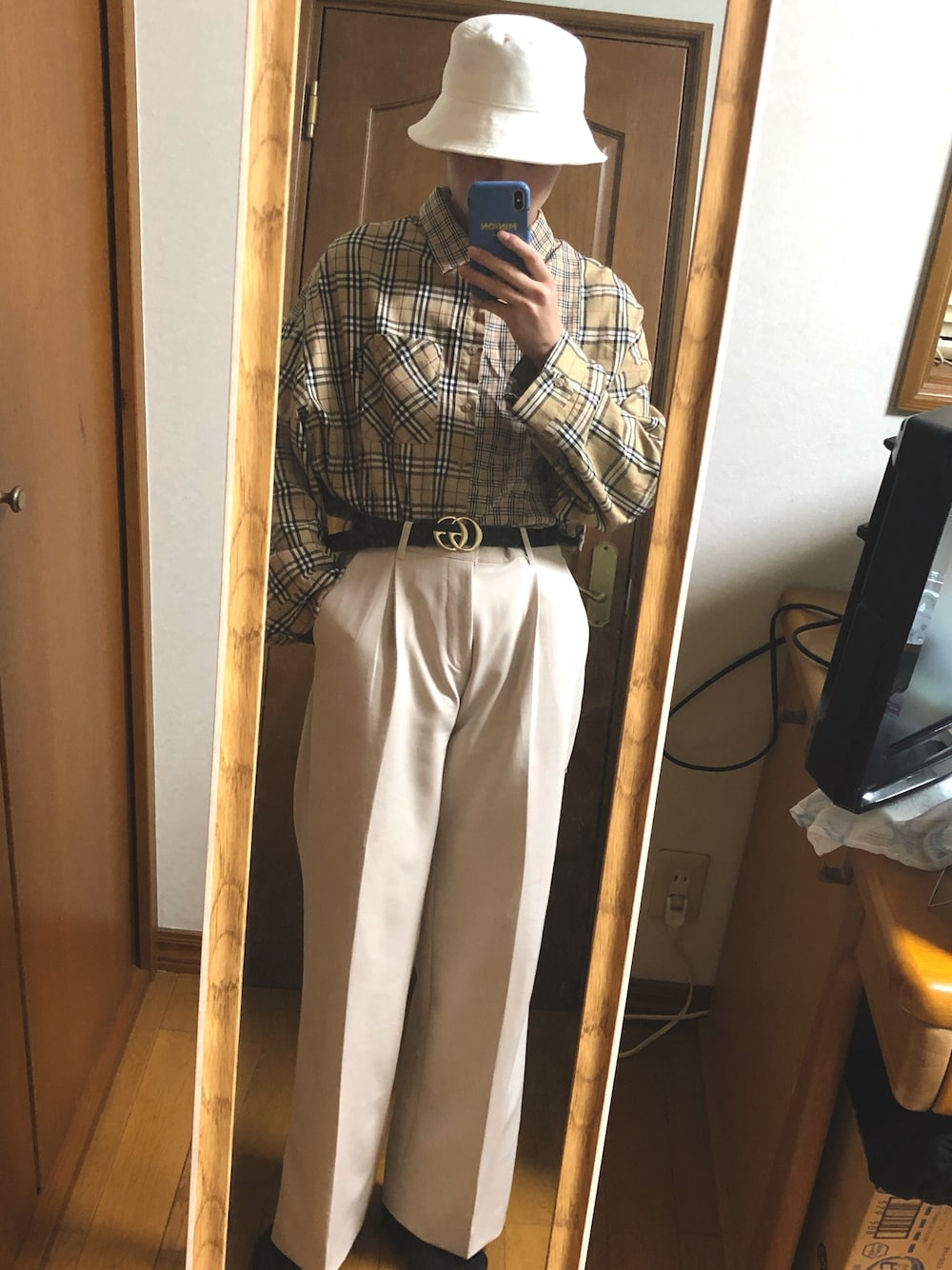 シャツ、スラックスはBUYMAで買いました! バーバリー柄のシャツが可愛い ライトベージュのスラックスで春っぽく