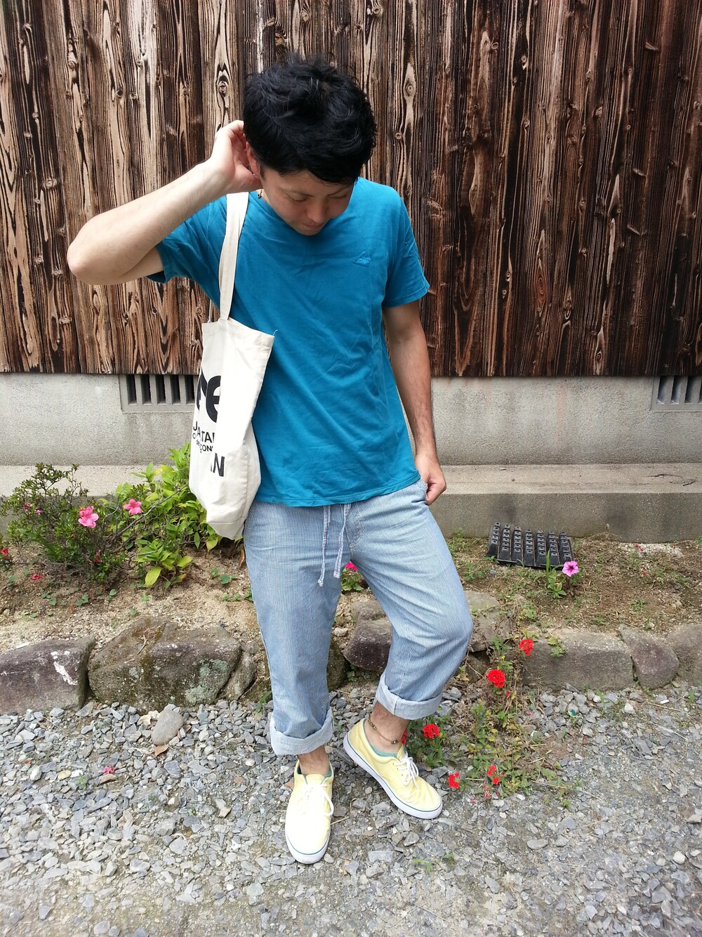 青のTシャツ探しましたが、このくらいしか持ってませんでした、 紺色とか水色ならあるんですが、青ってなかなか着ないってあらためて思いました! しかし、着てみたら意外に好きかも(*^^*) 今日のタグのエコバッグを添えてのコーデです。