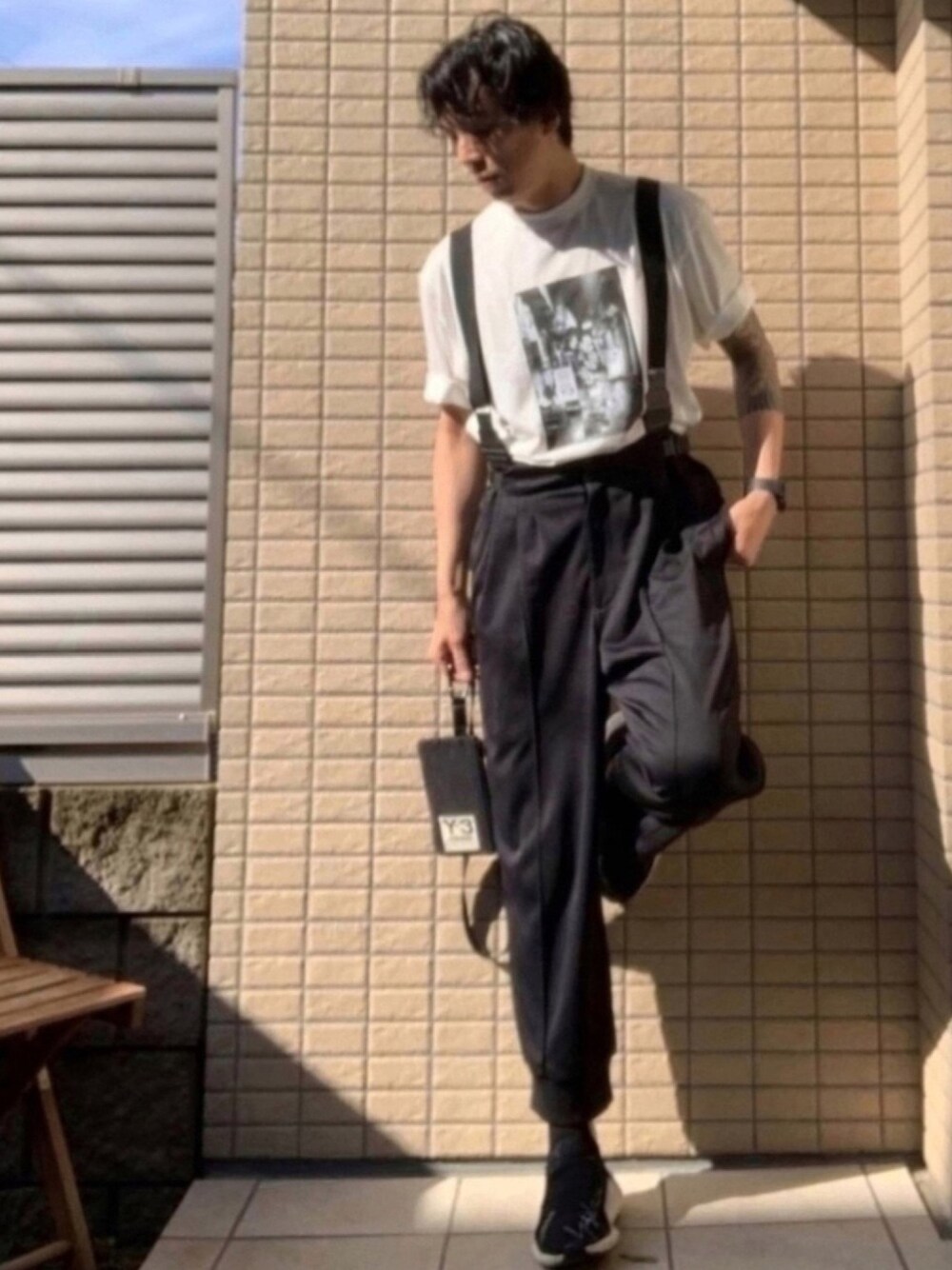 このサスペンダーのコーデが想像以上に自分にしっくりきたのでもう一枚📷 今後もサスペンダーの役目を果たすコーデを もっとやっていこうかなと思いました🌟 ちなみにこのt-shirtの写真の遊び心が好きですね😏 皆さんからのいいねやフォローなど沢山頂けるようになってめっちゃ嬉しいです🥺 有難う御座います☺️ Instagram ▶︎ panther_naito 《size》 t-shirt s pants s socks m sneaker 26.5cm Y-3が好きなんで僕の持ってるやつを 色んなパターンでコーデしていきますね〜🤟