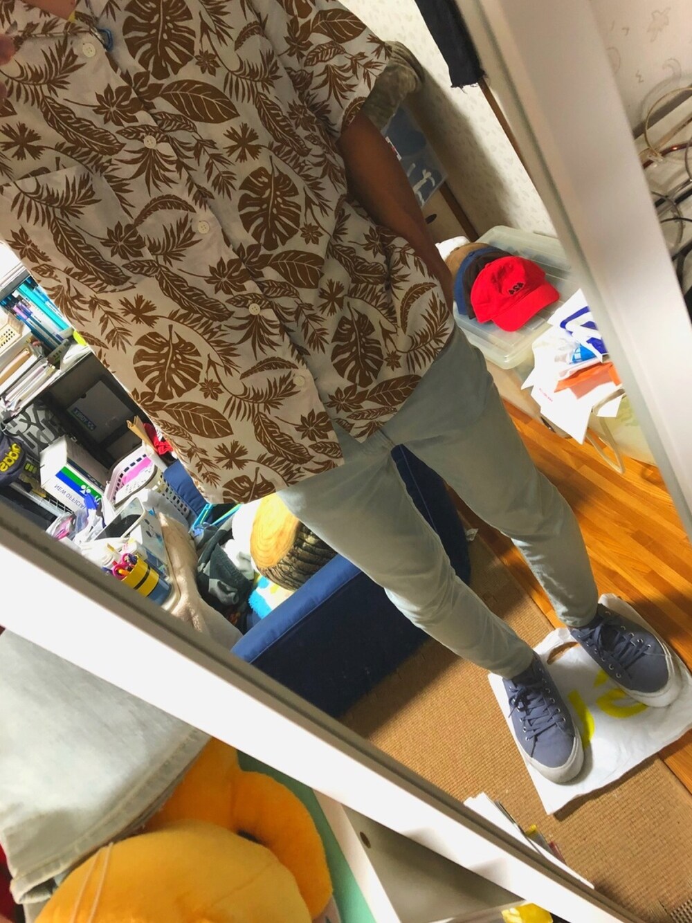今回はセールで買ったシャツを使用して、まだまだこれからの夏を楽しめるコーデ。 ビッグシャツなので、いつもよりワンサイズあげて違うコーデを楽しんでください。 リーフ柄なので、夏を一気に楽しんじゃって下さい‼︎