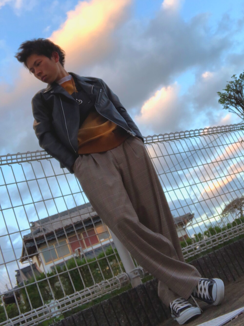 茶色をベースに黒で色をリンクさせ、ちょっとした白を取り入れて落ち着いたコーデ。 靴はハイカットスニーカーで普通のスニーカーと違った雰囲気が出ます。