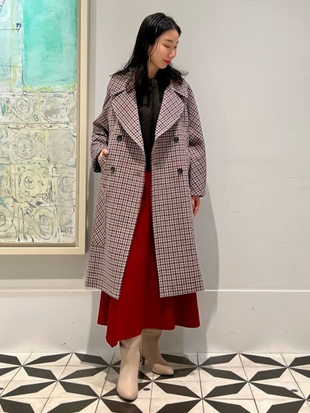 コートのチェック柄とスカートの赤をリンクさせたコーディネート。 〈MARTIN GRANT〉のコートは大きめの襟もバランス良くデザインされており、フェミニンからマニッシュまで幅広く着られるアイテム。 スカートは動きのあるアシンメトリーデザインで、女性らしい雰囲気が素敵です。