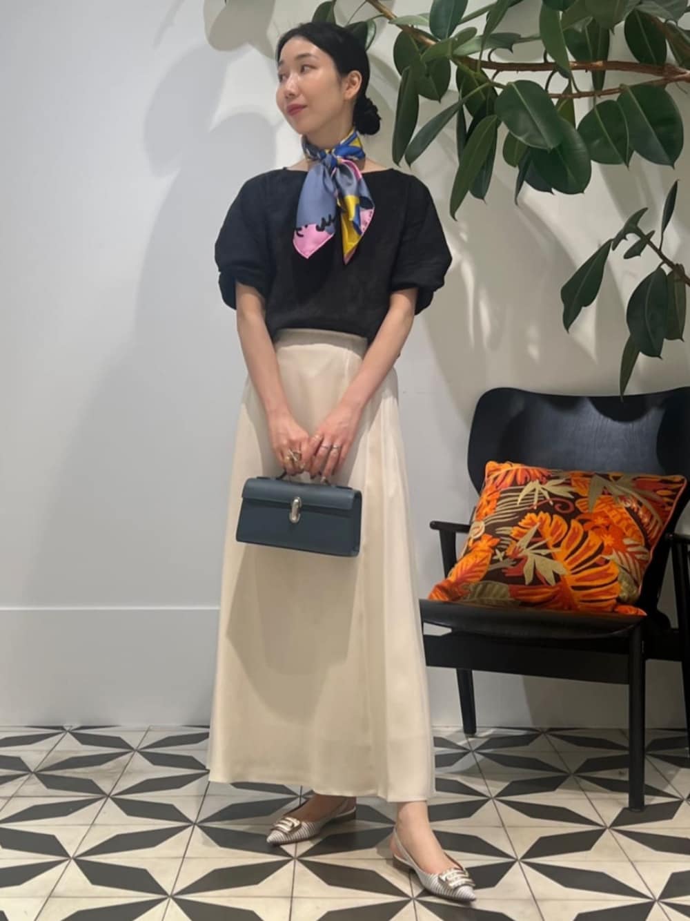 女性らしいブラウスとスカートのスタイリングはモノトーンでまとめると大人な印象に。 袖の立体感が特徴的なブラウスを活かすためにスカートで合わせる時は裾をインしたスタイルがおすすめ。 スカートは落ち感があり、揺れるたびに女性らしい印象のあるアイテム。