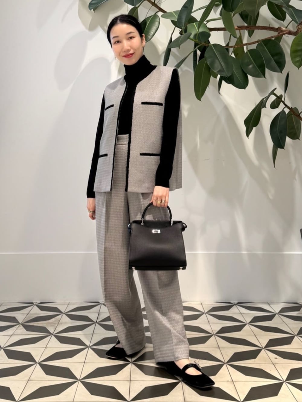 フェミニンな印象のあるツイードはインナーや小物をブラックでまとめてシックに着こなすことで甘すぎない大人のバランスに。 中をTシャツなどのカットソーなどでカジュアルなスタイルや、紐を外してブラウスとセットのベストと合わせて、オケージョンのシーンにもおすすめ。