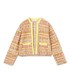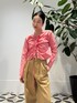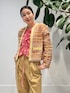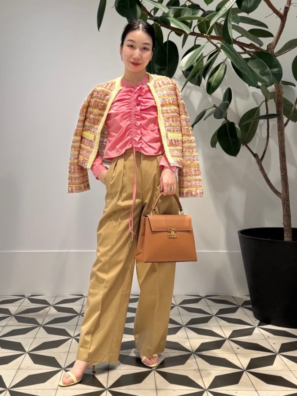 華やかなカラーが気分の高まるきれいめコーディネート。 ツイードカーディガンは軽やかな素材でさらりと着やすく、夏まで楽しめるアイテム。 同系色のブラウスと合わせてトップスは女性らしく、パンツはワイドシルエットのコットンチノでマニッシュに甘すぎない着こなしにしました。