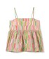 遊び心と洗練さを兼ね備えた大人の夏スタイル。 白地に繊細なフリルがあしらわれたノースリーブブラウスは、1枚でもフェミニンに着こなせる上品アイテム。 フロントのフリルが顔まわりに華やかさをプラスし、アクセサリーなしでも十分華のある印象に。 ジャージ素材なのでご自宅のお手入れが簡単なのも嬉しいポイント。 上から重ねたカラフルなキャミワンピースは、ポップなアートのような柄が目を惹くアイテム。 背面のボタンデザインが可愛らしく、バックスタイルにも抜かりなく、レイヤードにより着こなしに奥行きを与えています。 こっくりとしたテラコッタ色のワイドパンツが、カラフルなトップスとのバランスを取りながら季節感も演出。 リラックス感のあるシルエットが、程よい抜け感をプラスします。 白のワンハンドルバッグは、上品で使いやすいアイテム。どんなカラーにもマッチし、スタイル全体を引き締める役割。 足元はフラットサンダルでリラックス感がありつつ、ゴールドメタルがワンポイントに。 2wayの着こなしができるコーディネートで、キャミワンピースを脱げば、上品なフリルブラウス+テラコッタパンツのシンプルかつ洗練された着こなしに早変わり。 シーンに合わせたアレンジが可能です。 商品詳細については使用アイテムをご確認ください。