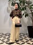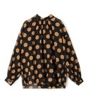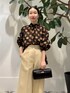 シアー感のあるドット柄ブラウスに、ライトベージュのワイドパンツを合わせたクラシカルなコーディネート。 程よい透け感が女性らしさを引き立てるブラウスは、首元のスタンドカラーとギャザーで上品な立体感を演出。 袖口のカフスがメリハリを添え、後ろリボンのディテールがさりげないポイントになっています。 パンツはハイウエストで脚長効果があり、ハリのある生地がシルエットを美しくキープ。 小物はブラックで統一し、スクエアフォルムのバッグとビジュー付きシューズでエレガントにまとめました。 デイリーからお食事会やホテルでの集まりなど、きちんと感を求めるシーンにも映えるスタイルです。 商品詳細については使用アイテムをご確認ください。