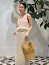 繊細なレース編みのワンピースを主役にした、夏らしい軽やかなスタイリング。 透け感のあるニット地に鮮やかな赤のインナーを差し込み、シンプルな中に華やかさを添えています。 ワンピースは着丈が長いので、ベルトでウエストを引き締めることでバランス良く仕上げました。 足元はベージュのフラットシューズで抜け感を出し、デイリーに取り入れやすいスタイルに。 また、レイヤードでデニムを覗かせるアレンジもポイント。フェミニンなレースにカジュアルな要素をプラスすることで、雰囲気を変えて楽しんでいただけます。 大きめのイエローベージュバッグを合わせ、シンプルな配色の中に温かみをプラス。 お出かけにもリラックスシーンにも寄り添う、ナチュラルフェミニンなコーディネートです。 商品詳細については使用アイテムをご確認ください。