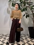 ラメのきらめきが美しいシアーニットを主役にした、華やかさと落ち着きを兼ね備えたコーディネート。 ほんのり透け感のある軽やかな素材が、シンプルながらも奥行きのある表情を演出します。 合わせたのは深みのあるブラウンのワイドパンツ。 ゆとりのあるシルエットが、トップスのきらめきを引き立てながら全体をシックにまとめてくれます。 足元にはダークグリーンのポインテッドトゥパンプスをプラス。 さりげないカラーアクセントで奥行きを出しつつ、落ち着いたトーンで統一感を保ちました。 アクセサリーはパールのネックレスとミニマルなリングを合わせ、クラシカルな品の良さをプラス。 コンパクトなバッグを添えることで、バランスの取れた大人のエレガンスが完成します。 ディナーや特別なお出かけはもちろん、オフィスでの華やぎスタイルとしてもおすすめのコーディネートです。 商品詳細については使用アイテムをご確認ください。