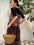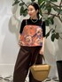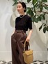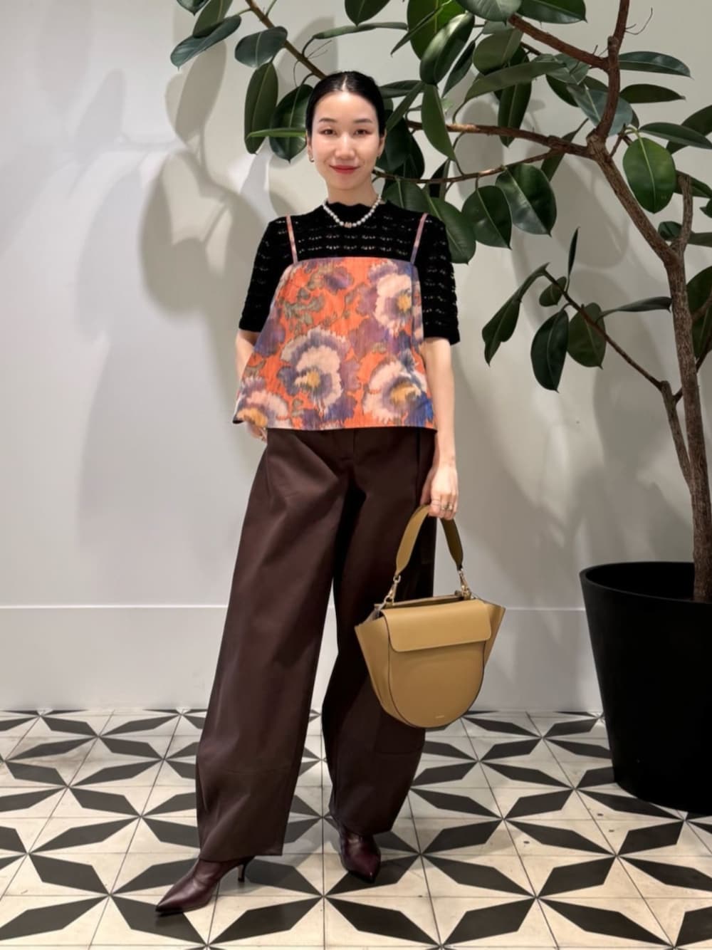 レースニットと花柄キャミソールをレイヤードした、遊び心のあるスタイリングです。 ブラックのレースニットは繊細な透け感があり、女性らしいエレガントさを引き立ててくれる一枚。 その上に重ねたキャミソールは、オレンジやパープルをベースにした華やかなフラワープリントで、晩夏から秋にかけて気分を明るくしてくれるカラーリングです。 落ち着いたダークトーンのパンツと合わせることで、彩り豊かなトップスが際立ちつつも、全体が上品にまとまります。 足元にはブラウンのショートブーツを合わせ、シックなトーンを重ねて季節感をプラス。 さらにキャメルのレザーバッグを添えることで、こっくりとした秋らしいニュアンスが加わり、大人の女性らしい落ち着きが漂います。 華やかな柄アイテムを取り入れつつも、ベースにダークトーンを選ぶことで、日常の延長で楽しめるモード感のあるスタイルに仕上がっています。 お食事やちょっとしたお出かけにもぴったりなコーディネートです。 商品詳細については使用アイテムをご確認ください。