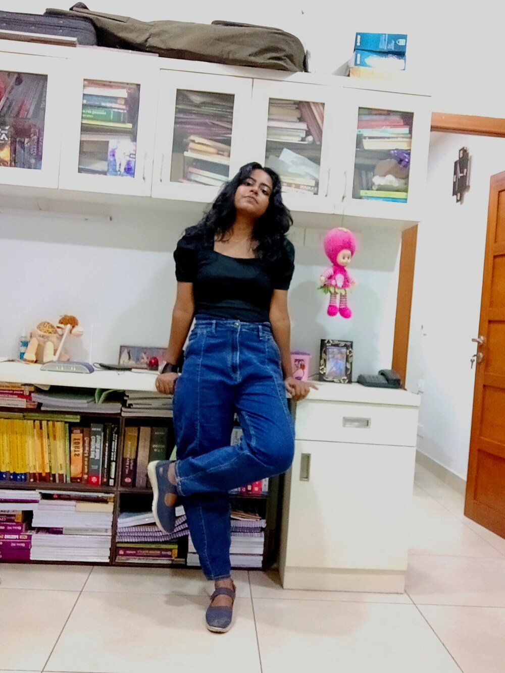 Comfortable Parachute Jeans with Black Puff-sleeved Fitted Top :)