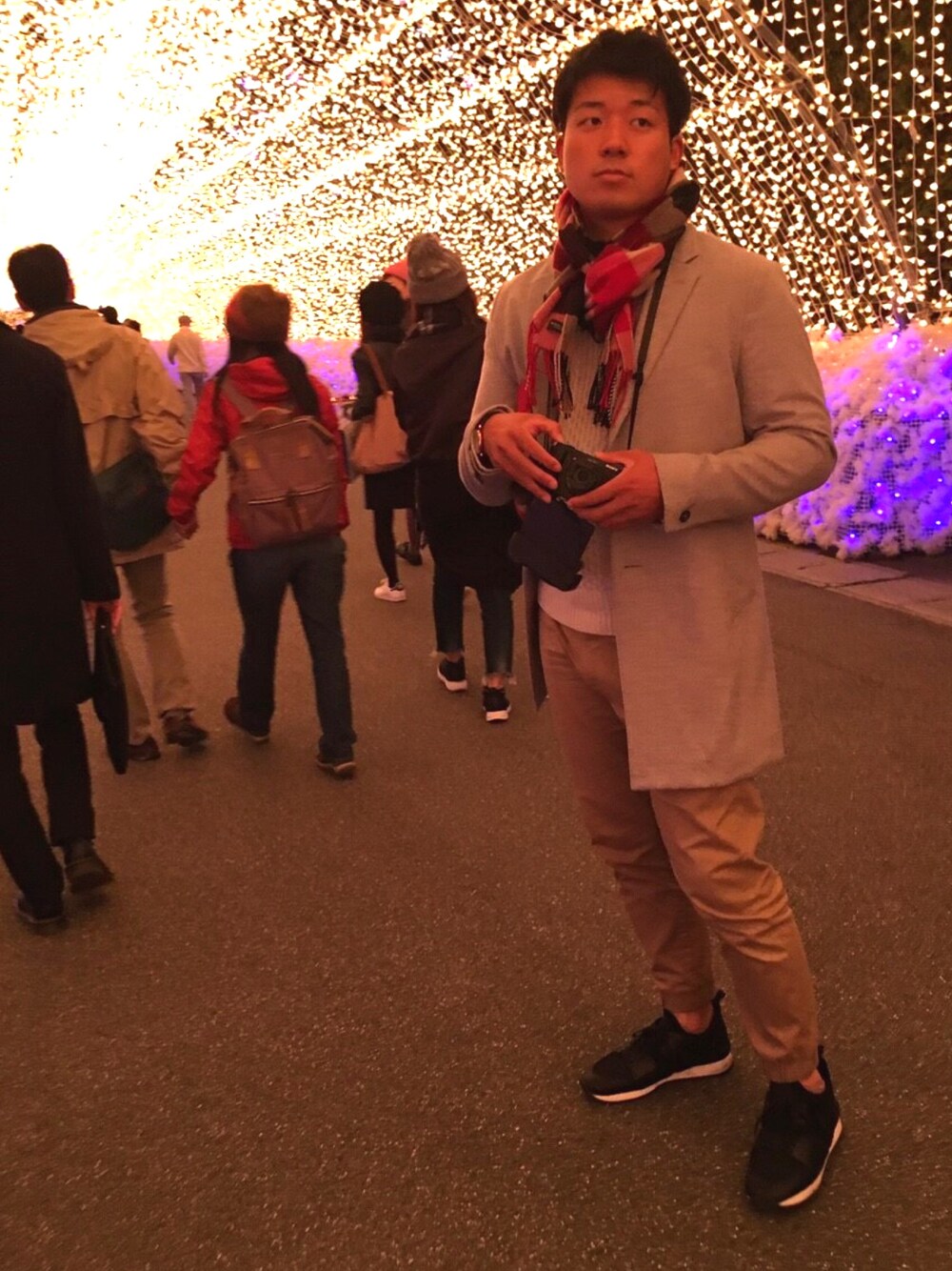紅葉とイルミネーションを見にドライブ🚙 楽に羽織れるチェスターコートに歩けるようにジョガーパンツとスニーカーを合わせました♪ ブラックレーベルチェックのマフラーがアクセントです! カメラも忘れずに📸^^笑