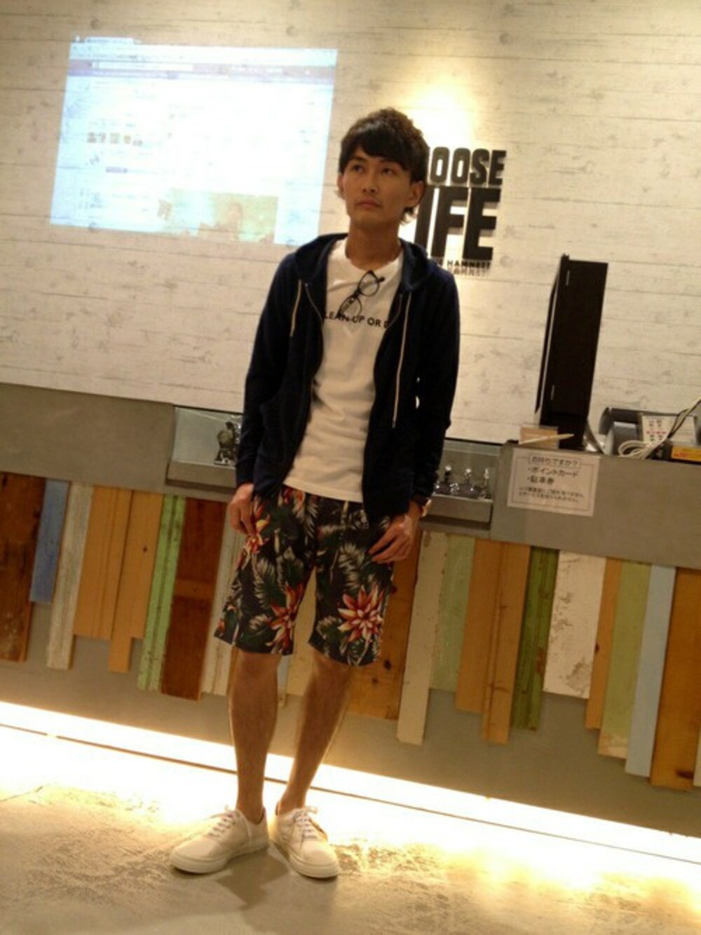 着心地の良いパイル地のパーカーにショートパンツを合わせたシンプルコーディネート。 トロピカル柄の入ったサマーコーデュロイの珍しい生地感のショートパンツがポイントです。