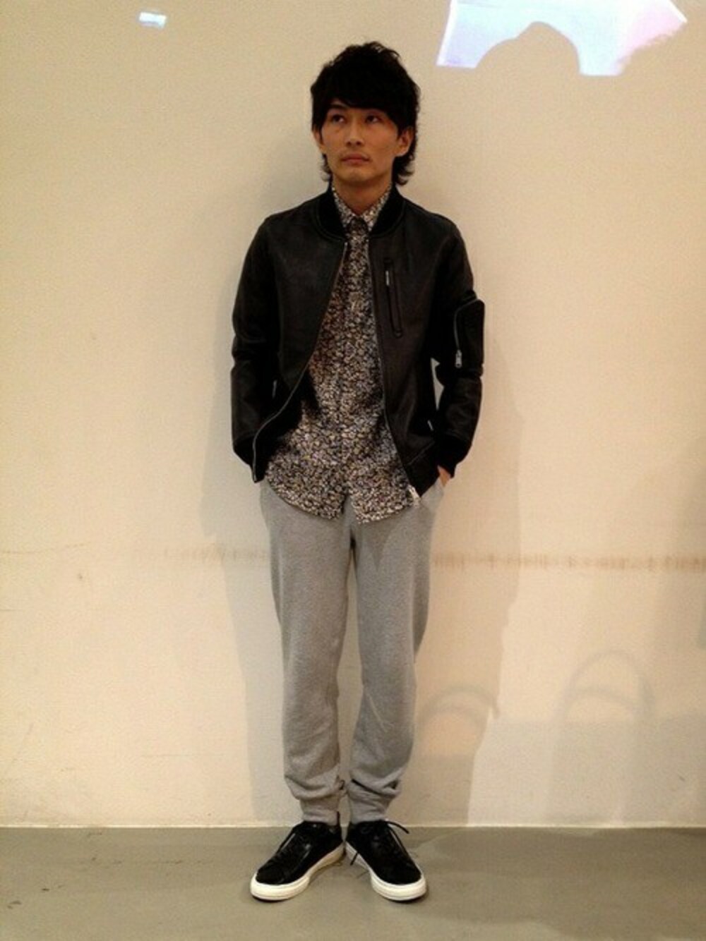 『レザー』×『スウェット』コーディネート。 インナーのリバティプリントシャツがアクセント。