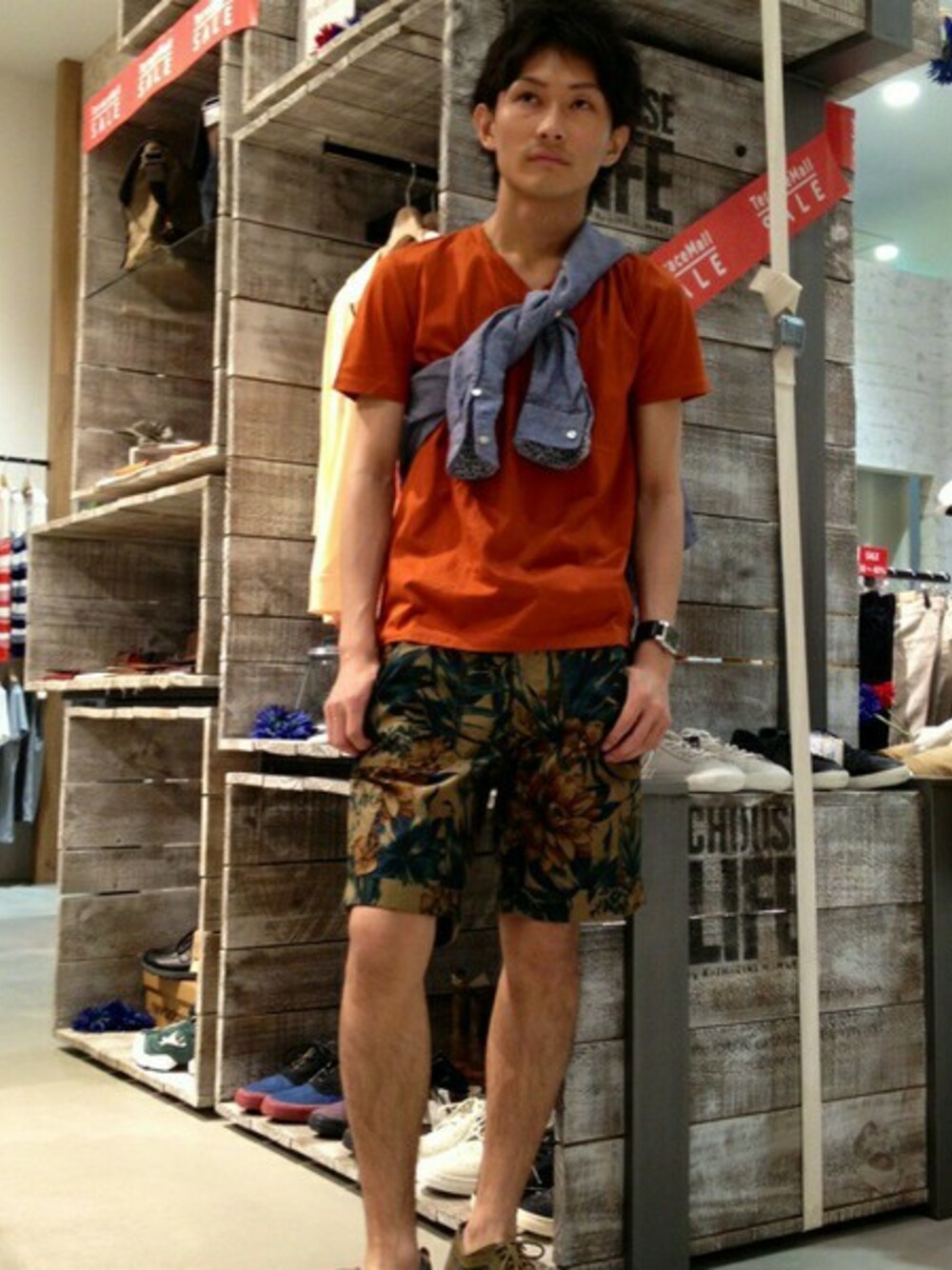 鮮やかなオレンジのカットソーが主役のコーディネート! トレンドの柄ショートパンツとの相性抜群です。