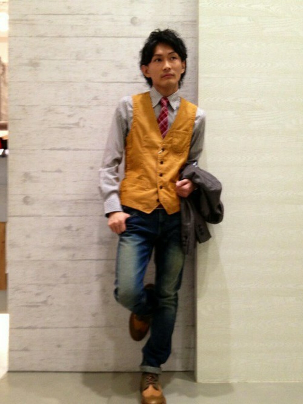 マスタードの色味がキレイなベストが主役のコーディネート!! ベストはCOOLMAX素材を使用しているため、夏でも快適に着用頂けます。