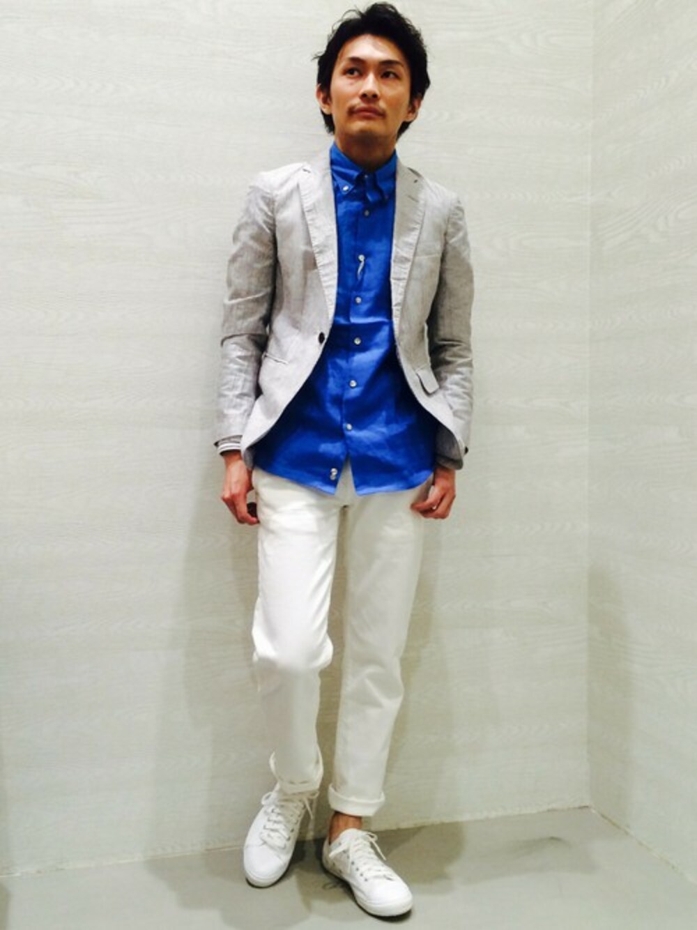 ホワイトパンツにホワイトシューズのコーデ。 コットンリネンの薄手のジャケットはシャツ感覚で羽織るのに最適です。