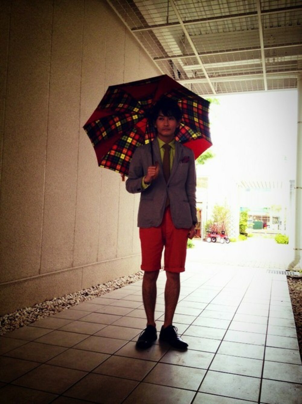 梅雨の時期に着たいジャケットスタイル。 カラフルな洋服と傘の色を統一させて傘もコーディネートの一部にしています。