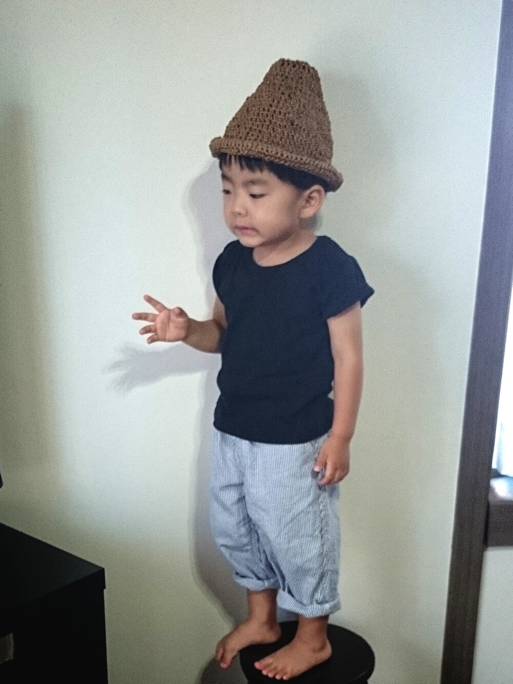 帽子編んでみました 帽子…handmade Tシャツ…西松屋 パンツ…GU