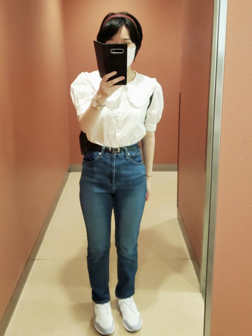 本日のコーデ。 甘めのビックカラーブラウスとデニムパンツで甘カジュアルに。 足元はNIKEのスニーカーで、辛口に仕上げました。