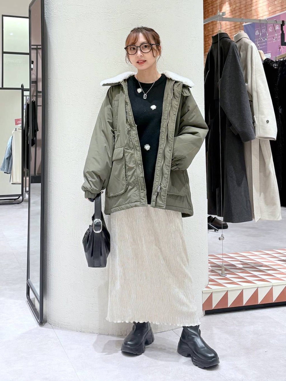 大人カジュアルコーデ🤍 少しポップな印象になりがちなドット柄も ドットの配置に距離をもたせることで 大人でも着やすいデザインに✨ アウターのボアは取り外しが可能ですჱ̒⸝⸝•̀֊•́⸝⸝)